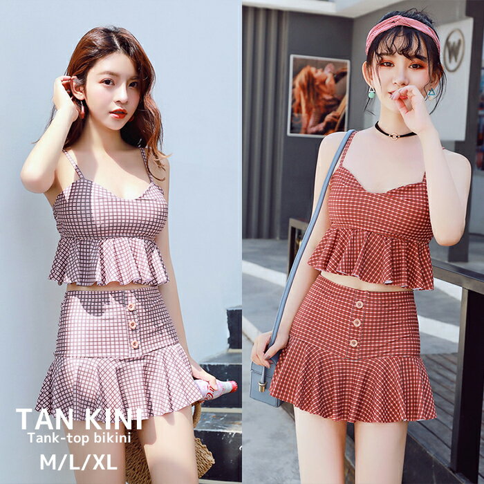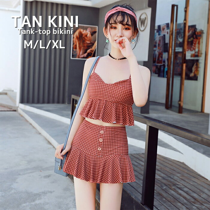 水着 体型カバー レディース タンキニ ビキニ ビスチェ 2点セット バックフリル オトナ女子 可愛い おしゃれ チェック バックフレア シンプル セパレート ガーリー レトロ レッド ピンク 2019新作